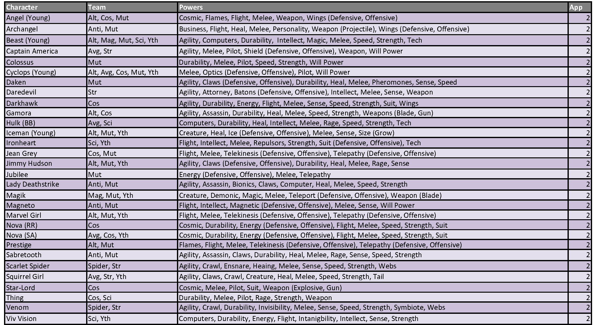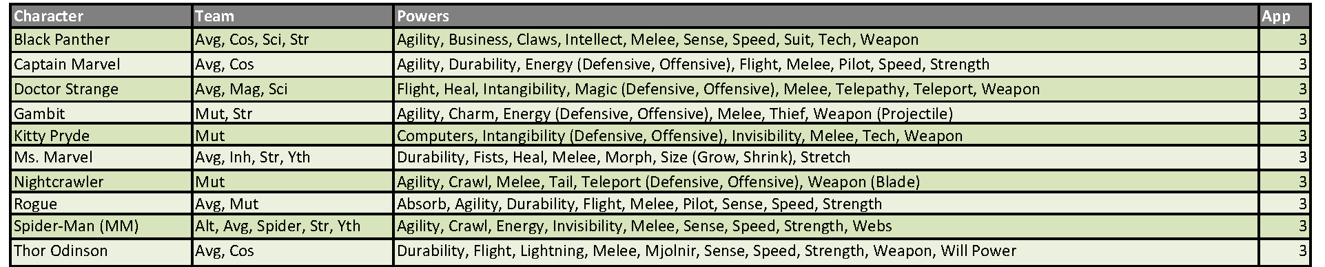 These appearance estimates, based on comic solicitations and cover artwork provided by the Marvel Database wiki, are meant as a guideline and not an indication of a specific draft order. Character names, team designations and power sets conform to the most current information provided by the Database. Power designations are simplified for easier classification and choice, providing the majority of the heroes with 9 to 11 eligible powers from which to choose. As a reminder, you may only have one hero per team designation on your roster and are allowed to select three powers from the heroes’ power set. Powers in (parenthesis) are a subset of the overall ability and can be selected as well as the generic use of that power. For example, Deadpool can be drafted as any of his four team classifications and can use Weapons, Blades and Guns as his three powers (Blades and Guns being a subset of the overall Weapons skill).