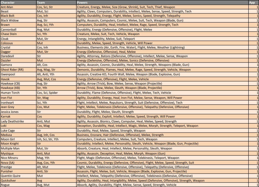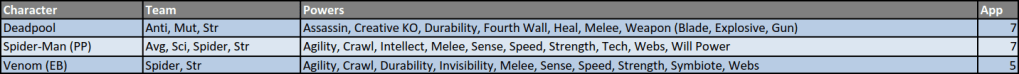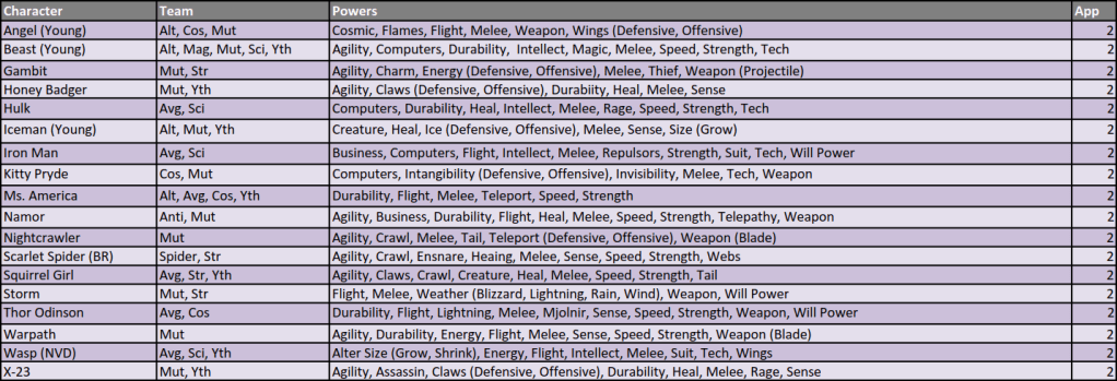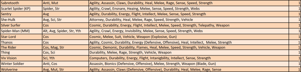 These appearance estimates, based on comic solicitations and cover artwork provided by the Marvel Database wiki, are meant as a guideline and not an indication of a specific draft order. Character names, team designations and power sets conform to the most current information provided by the Database. Power designations are simplified for easier classification and choice, providing the majority of the heroes with 9 to 11 eligible powers from which to choose. As a reminder, you may only have one hero per team designation on your roster and are allowed to select three powers from the heroes’ power set. Powers in (parenthesis) are a subset of the overall ability and can be selected as well as the generic use of that power. For example, Deadpool can be drafted as any of his four team classifications and can use Weapons, Blades and Guns as his three powers (Blades and Guns being a subset of the overall Weapons skill).