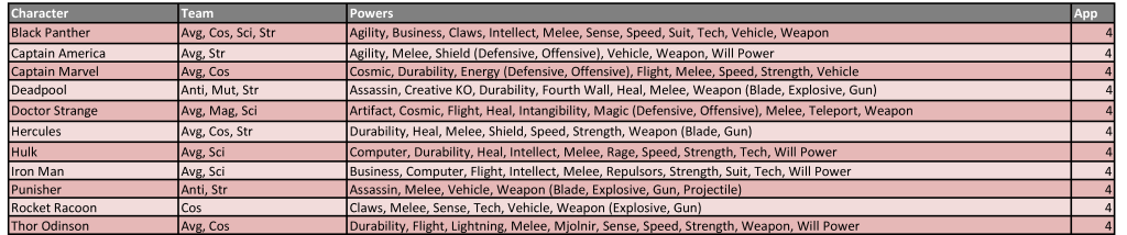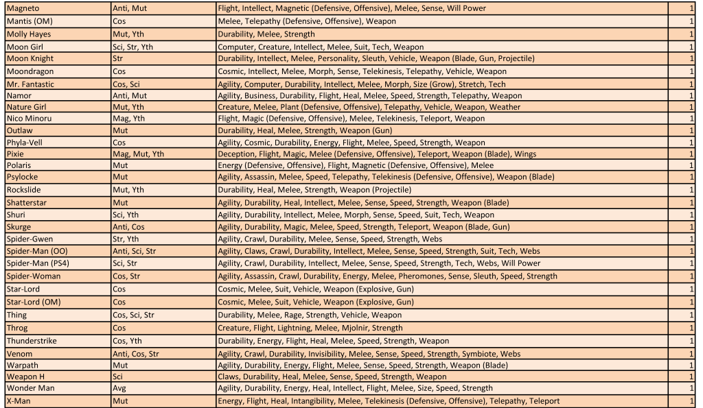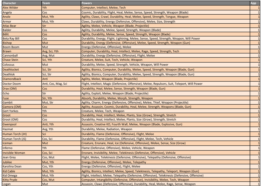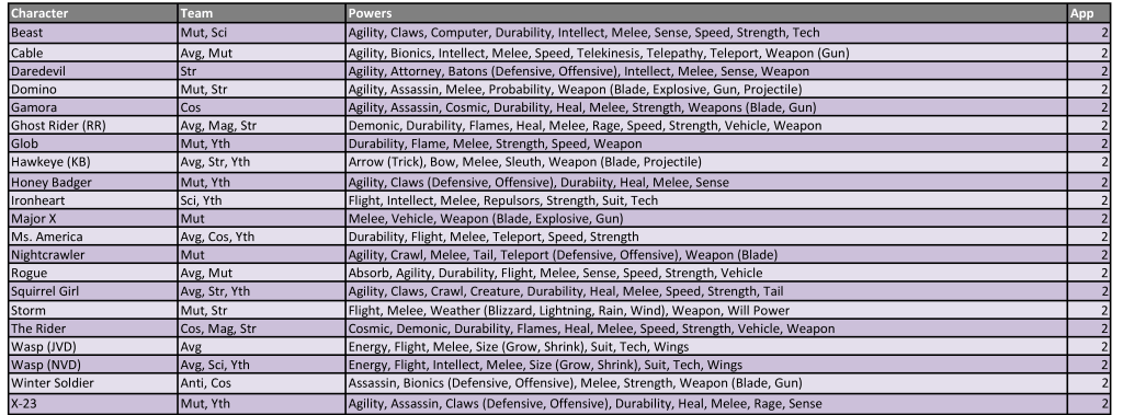 Power designations are simplified for easier classification and choice, providing the majority of the heroes with up to 11 eligible powers from which to choose. As a reminder, you may only have one hero per team designation on your roster and are allowed to select three powers from the heroes’ power set. Powers in (parenthesis) are a subset of the overall ability and can be selected as well as the generic use of that power. For example, Deadpool can be drafted as any of his four team classifications and can use Weapons, Blades and Guns as his three powers (Blades and Guns being a subset of the overall Weapons skill).
