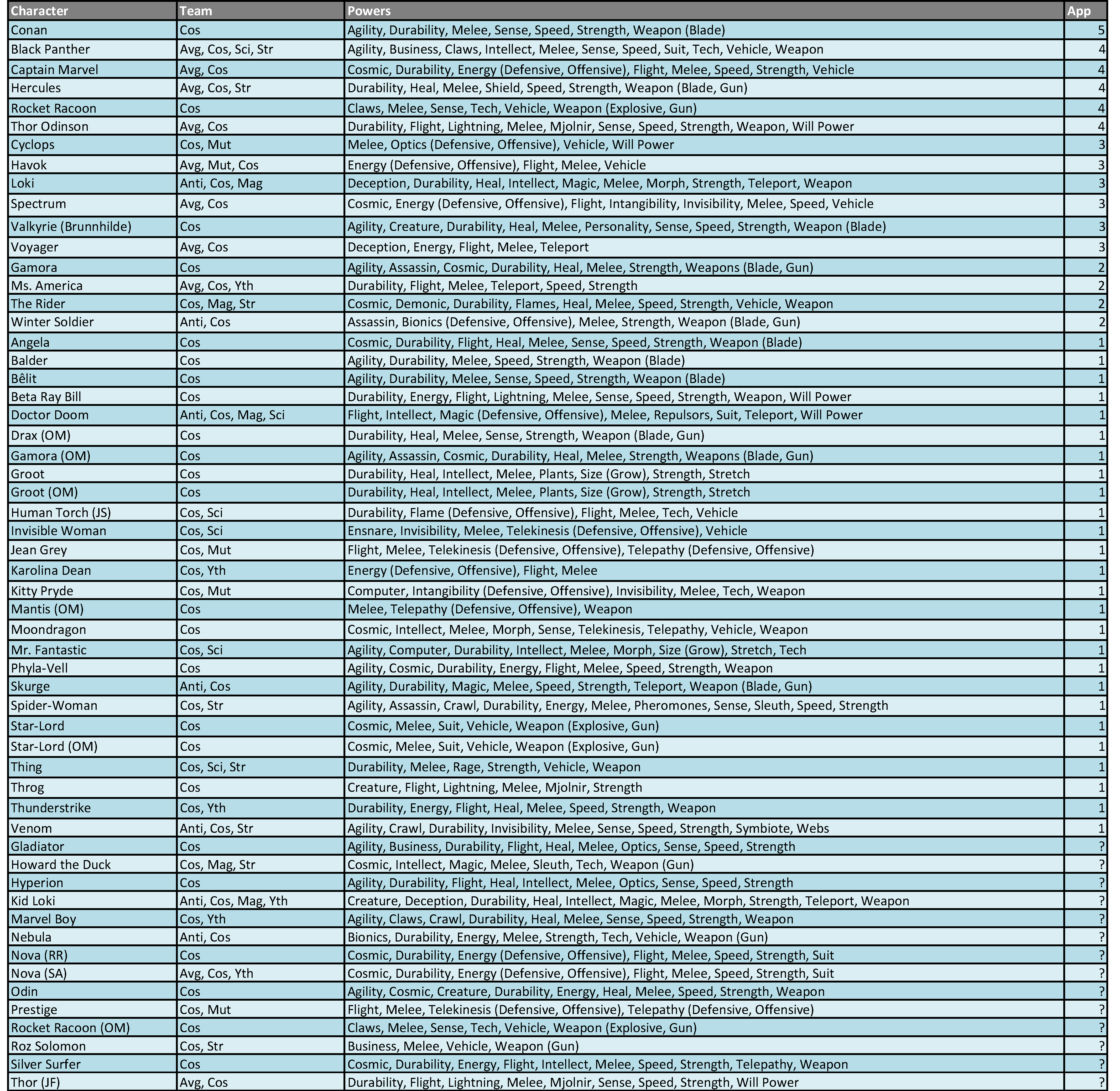 Monthly theme for the Free-for-All Themed challenge: Take up arms and battle alongside the Asgardians, draft a team of only Cosmic characters. Restrictions on team affiliations and power selections still apply. A list of eligible Cosmic heroes is provided at this link. Please provide your Free-for-All rosters prior to Wednesday, April 3, 2019 using the online draft form.