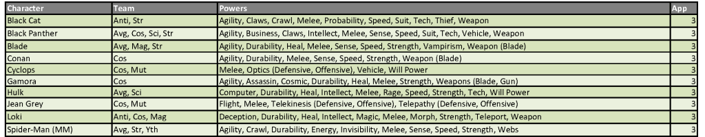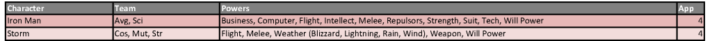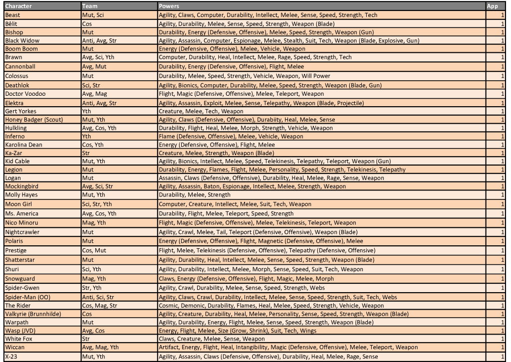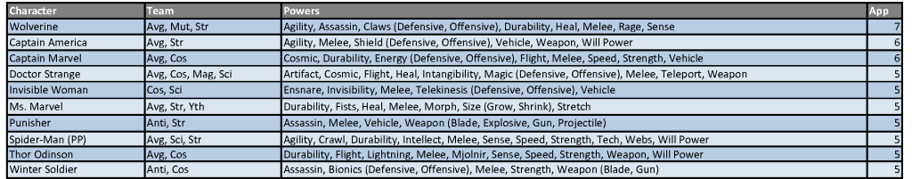 Power designations are simplified for easier classification and choice, providing the majority of the heroes with up to 11 eligible powers from which to choose. As a reminder, you may only have one hero per team designation on your roster and are allowed to select three powers from the heroes’ power set. Powers in (parenthesis) are a subset of the overall ability and can be selected as well as the generic use of that power. For example, Deadpool can be drafted as any of his four team classifications and can use Weapons, Blades and Guns as his three powers (Blades and Guns being a subset of the overall Weapons skill).