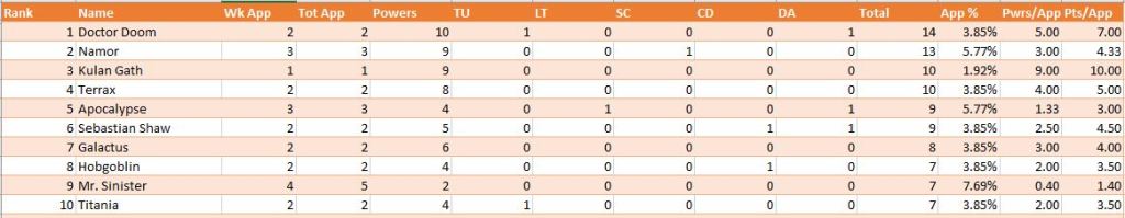 The top antagonists at the start of the year are two of the Fantastic Four’s main villains. Doctor Doom currently sits atop the charts with 14 points across two appearances, while Namor finishes in a close second with 13 points in three appearances. Sorcerer Kulan Gath begins the year by qualifying for stat keeping with his 36th overall appearance in comics. His nine powers in one appearance launch him into third place with a Pt/App ratio of 10.0. Apocalypse (5th), Sebastian Shaw (6th) and Mr. Sinister (9th) take advantage of their truce with the X-Men to earn a spot in the top Antagonists power rankings, with Sinister appearing in each of the five weeks in January.