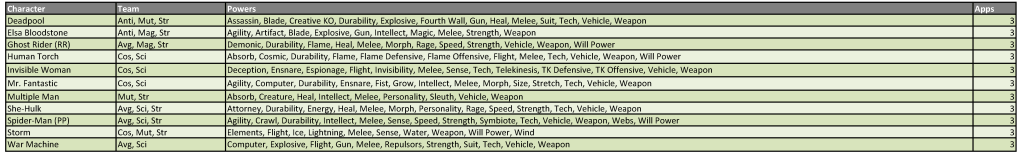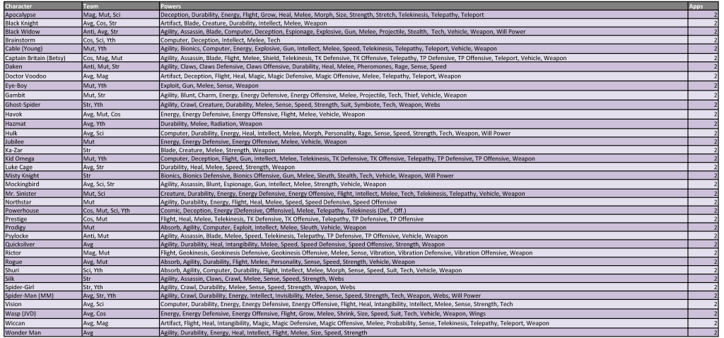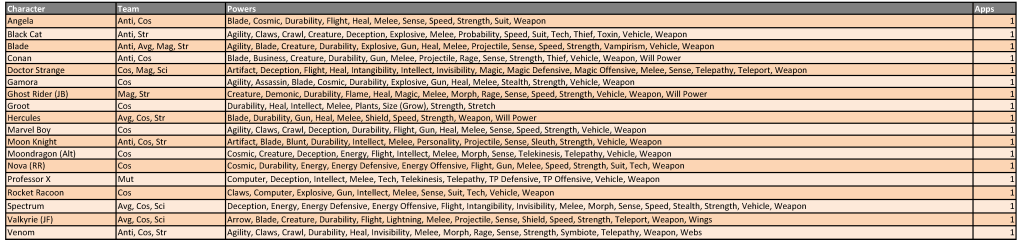 Please see the attached Power Summary file for further power clarifications and follow along with our #FantasyComicLeague tweets on Twitter for official power scoring and discussions. Appearance estimates, based on comic solicitations and cover artwork provided by the Marvel Database wiki, are meant as a guideline and not an indication of a specific draft order.