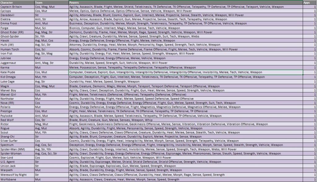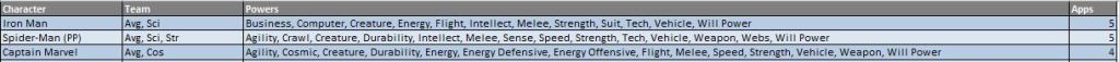 Please see the attached Power Summary file for further power clarifications and follow along with our #FantasyComicLeague tweets on Twitter for official power scoring and discussions. Appearance estimates, based on comic solicitations and cover artwork provided by the Marvel Database wiki, are meant as a guideline and not an indication of a specific draft order.
