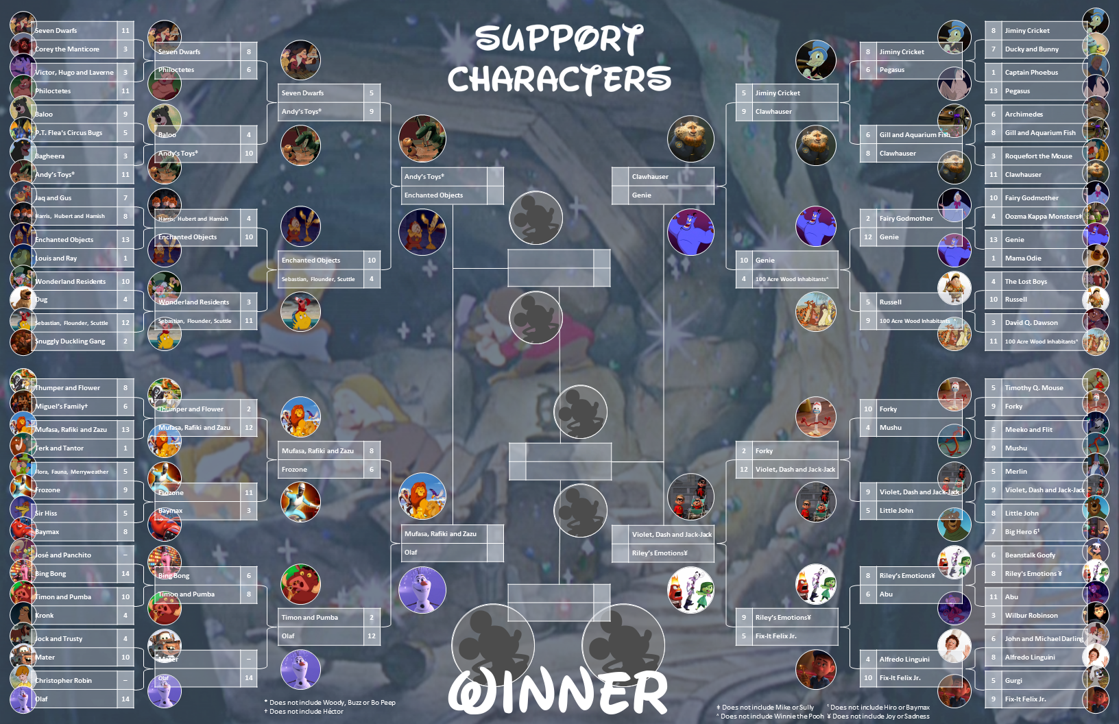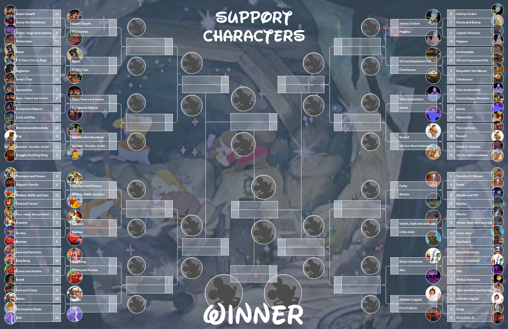 All sorts of brackets pop up this time of year to capitalize on the bracket-making, March Madness craze. Disney characters, movies and songs are frequently seen in competitions, but many of these brackets seem to exclude some classic movies and characters. Well, my family set out to right this injustice by holding an ultimate Disney Character Bracket Challenge that spans the decades of Disney animated media (plus Pixar). We established four brackets of 64 characters each that fit into four categories: Support, Villains, Heroes and Heroines. The 14 voting members of the Bradley family, ranging in age from 75-3, with a median age of 32, will then vote to determine which characters advance until a winner for each bracket is chosen. When all four brackets are complete, the top 16 from each bracket will come together in the Ultimate Disney Character Bracket.