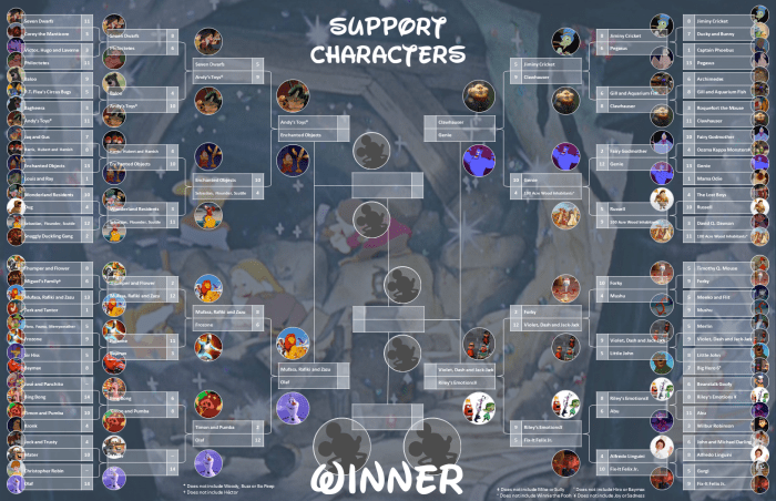 First up, the Support Character Bracket. Our chosen characters were sorted chronologically starting with the Disney animated movies proper, then the Pixar characters. This may have been the first misstep, because it lined up a lot of the classic characters against some of the more modern Pixar characters, such as Merlin versus the Incredibles kids. Sadly, my main mage did not connect with the younger audience in the family and lost his first matchup 9-5. Gurgi, another personal favorite, lost by the same margin to Fix-it Felix Jr., but that was not too surprising given how little love The Black Cauldron receives. Some of the other classic support characters fared a bit better against the newer characters, such as Little John and Baloo. Both of the Phil Harris-voiced bears advanced, but lost to a pair of Pixar participants in the next round.